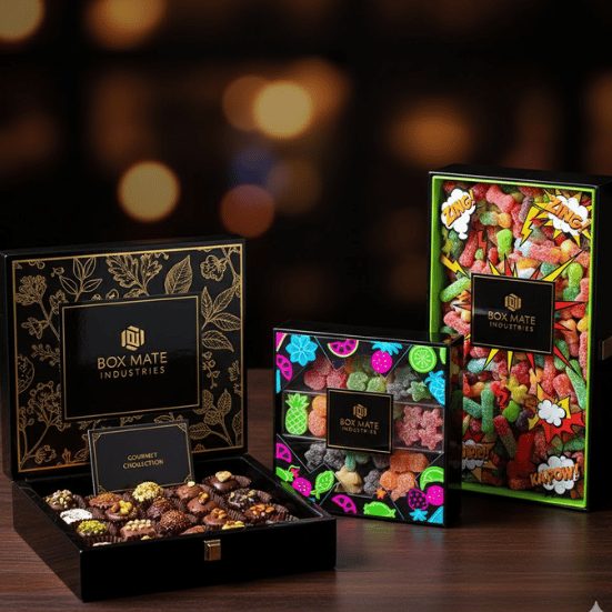 Custom candy subscription boxes from Box Mate Industries LLC bring tailored delight to every recipient. Each printed box is uniquely designed to match your flavor selection and brand identity, ensuring that no two candy boxes are the same. Explore creative packaging options perfect for chocolates, gummies, and sour candies.