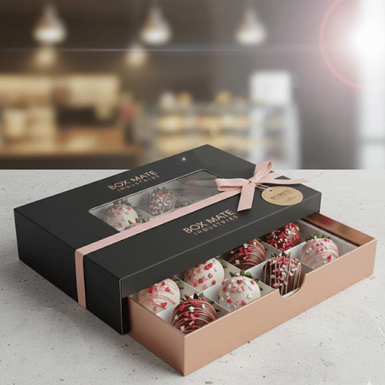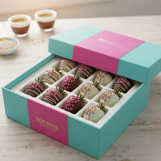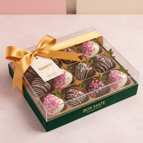 Elevate the presentation of your chocolate-covered strawberries with fully customizable packaging by Box Mate Industries LLC. Make your boxes as tempting as the treats inside with tailored design options, luxurious finishes, and vibrant color themes. Choose from a wide variety of free design templates, and select from premium materials like classic kraft, smooth cardstock, or even rich velvet finishes — all made to enhance shelf appeal and customer delight.