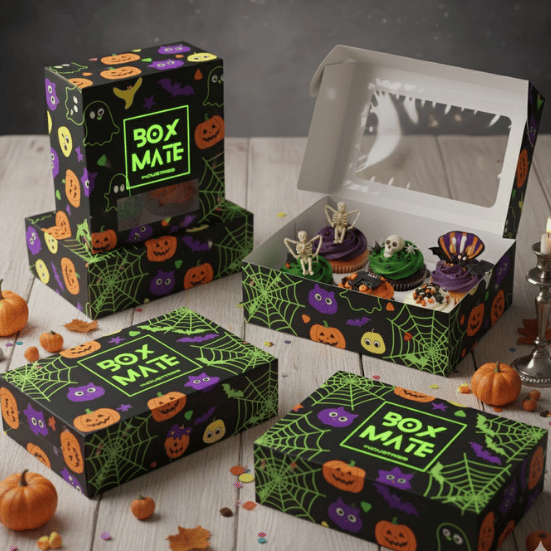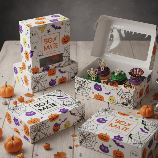 Our Halloween cupcake boxes come in a variety of styles tailored to your specific needs. Featuring sturdy top handles that maintain the box’s integrity, these durable structures provide reliable support for your baked goods. Made from reusable materials, these boxes are also practical for storing food items beyond the event. The safety and protection these custom boxes offer ensure your cupcakes arrive fresh and intact.