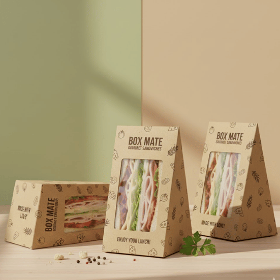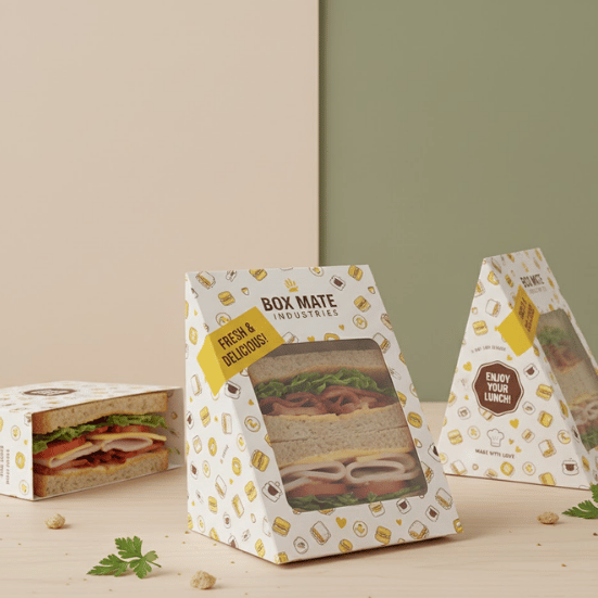 Get premium custom sandwich boxes in bulk at unbeatable wholesale prices. Personalize your sandwich packaging with original artwork, choosing from various sizes, colors, and shapes to create an attractive, high-quality appearance that enhances your product’s appeal.